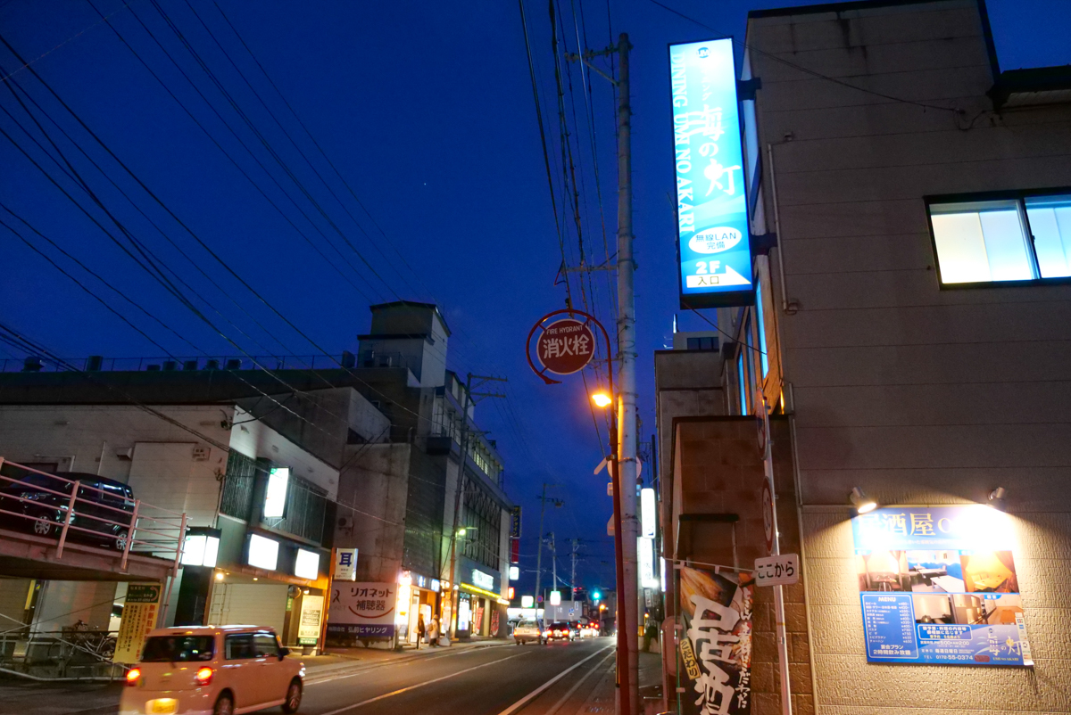まずは本町にある「ダイニング 海の灯」。通り沿いの青い看板が印象的で、どんなお店だろうと気になっていた人も多いはず。産地や魚の鮮度にこだわった海鮮料理を提供している人気店で、小泊出身のオーナー自らが釣った魚が使われるときもあるのだとか。早速中に入ってみることにしました。
