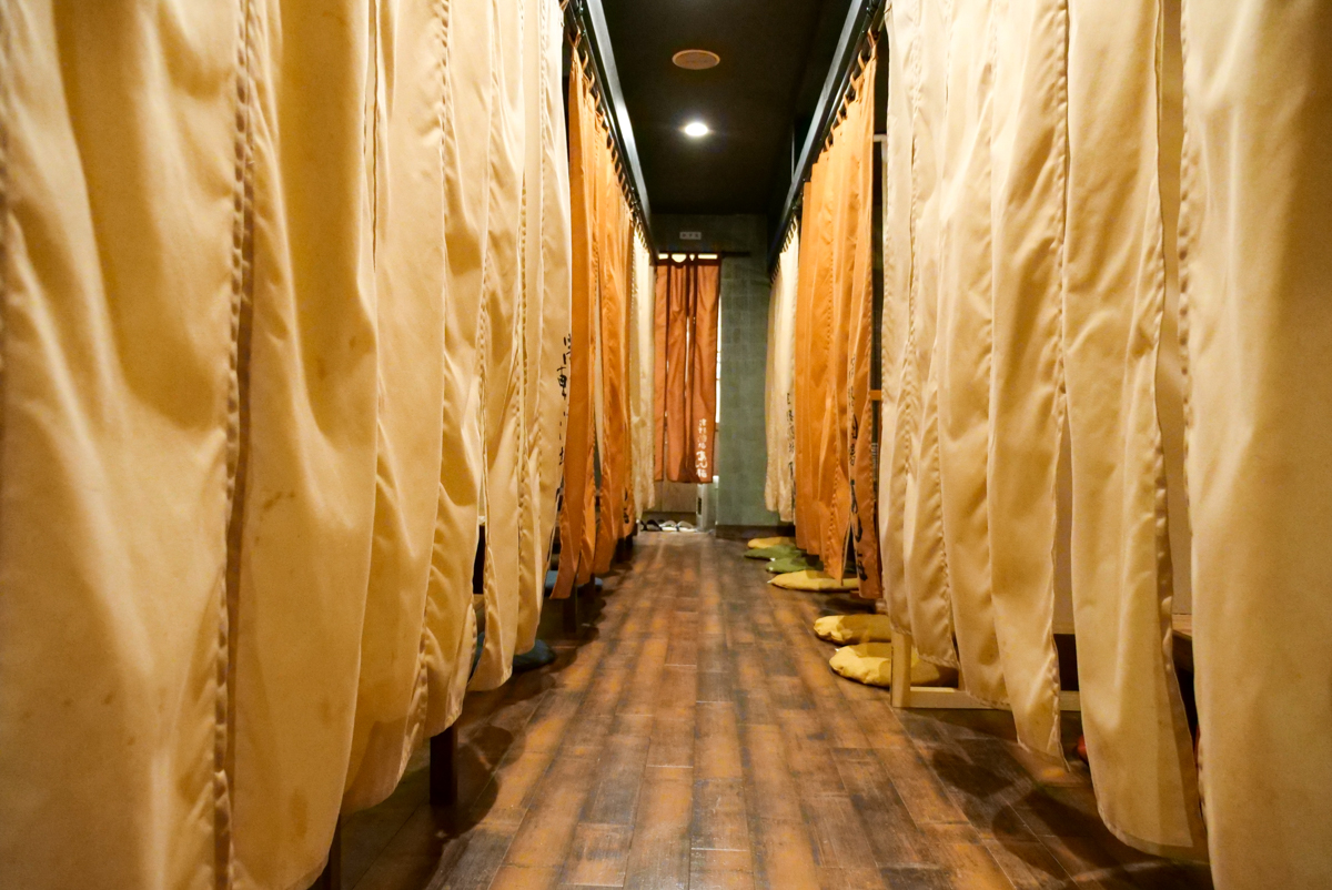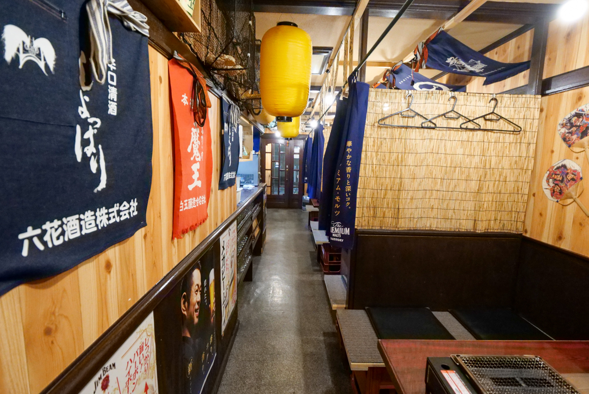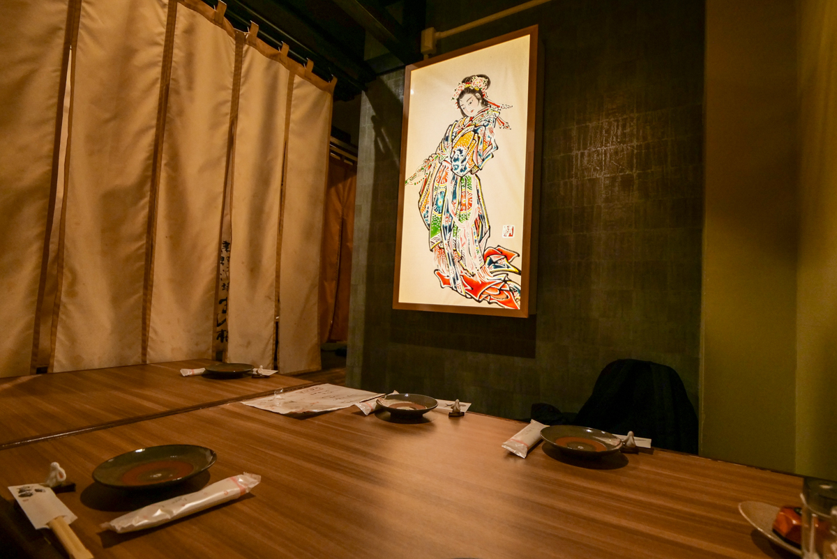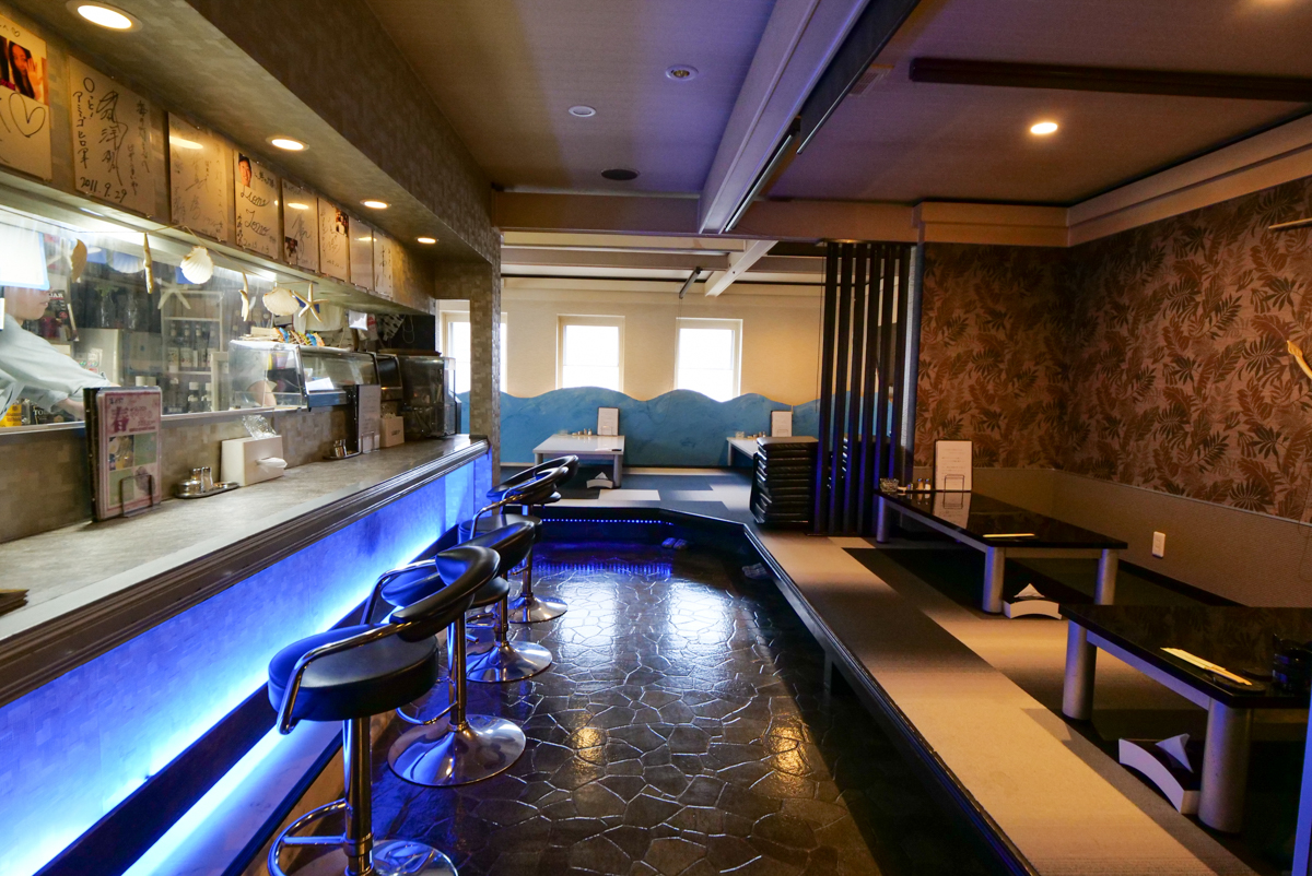 店内に入ると、ブルーの照明が印象的なカウンターに小上がりの座敷、そして個室もあるオールマイティーな作り。20名前後の宴会や、個室も最大10名まで入れるため、どんな用途でも使いやすい空間になっています。