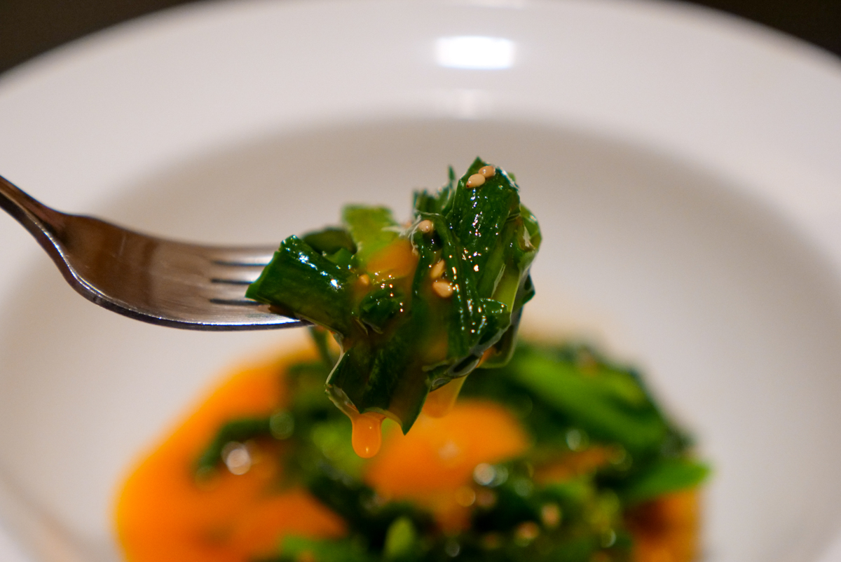 そして隠れた人気メニューなのが「ニラの卵黄のっけ」。自家製タレに浸したニラの上に卵黄がちょこんとのった可愛らしい料理ですが、これが意外なほどよく合うんです。ニラとラー油のピリっとした風味に卵のまろやかさが加わって、バランスがよく新しい美味しさ。