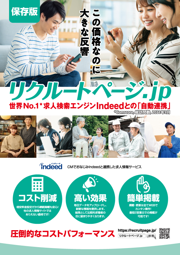 リクルートページ.jpは、世界最大級の求人検索エンジンIndeedと自動で連携する求人情報サービスです。
