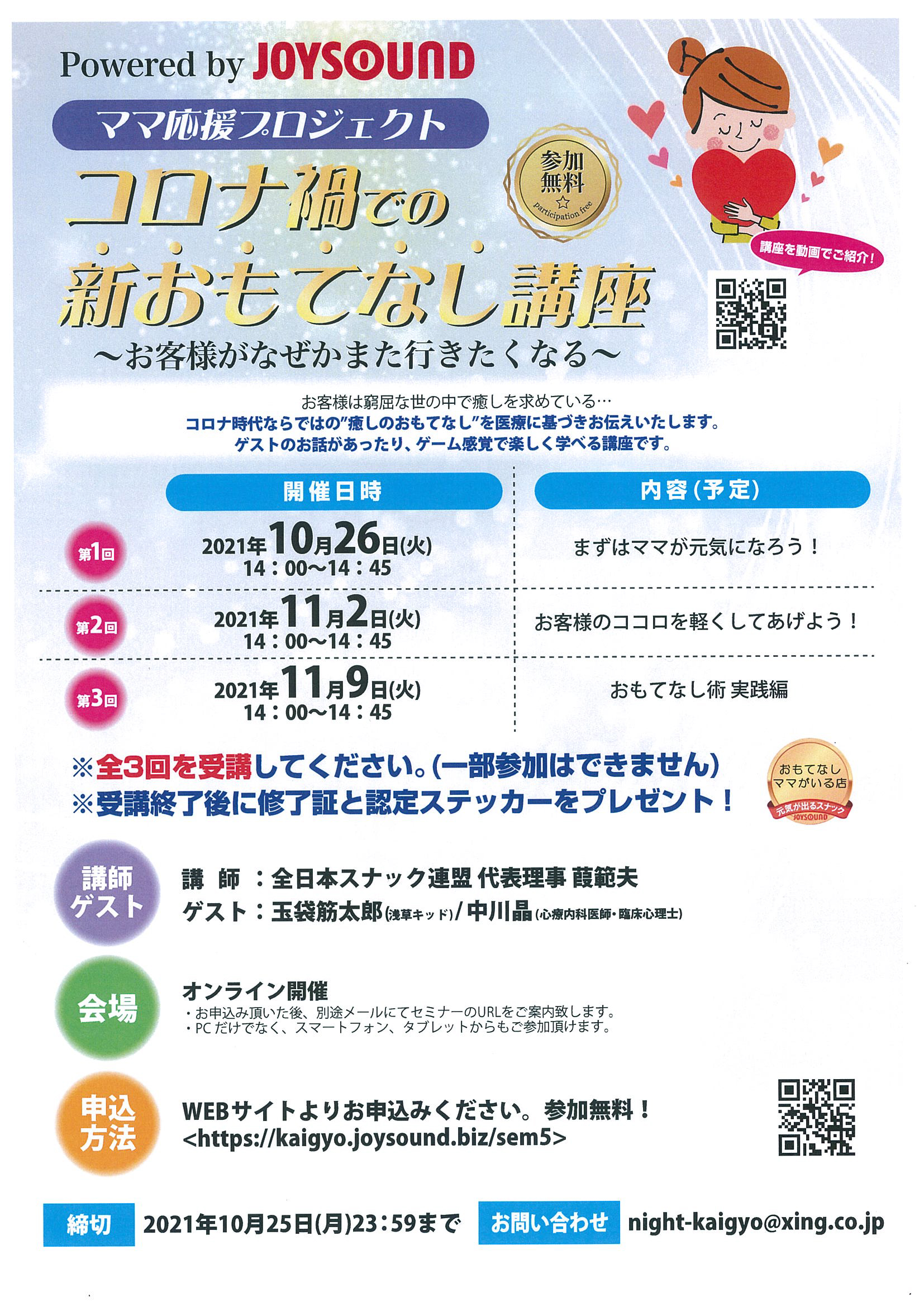 ジョイサウンド様より、スナック&バーのママさん向けの「コロナ禍での新おもてなし講座~お客様がなぜかまた行きたくなる~」が10/26(火)午後2時より開催されます♪ 全3回の講座となっており、無料... 続きを読む