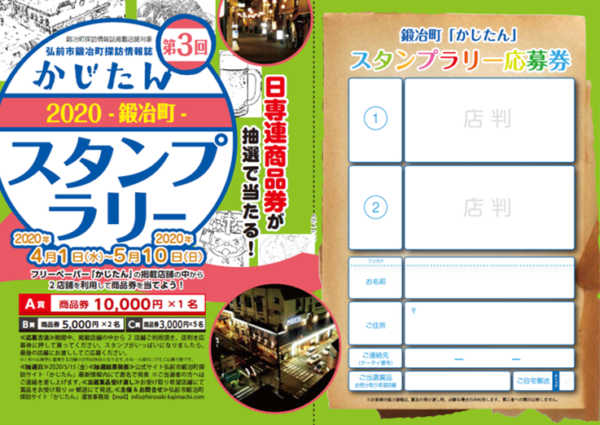 第3回「かじたん」スタンプラリー 【イベント期間】 2020年4月1日(水)~2020年5月10日(日) 【応募方法】 期間中、フリーペーパー「かじたん」の掲載店舗から、2店舗... 続きを読む